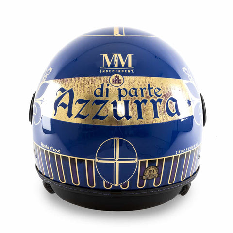 Casco a reacción Mm independiente dedicado aFútbol histórico florentino, con los colores y el símbolo del Parte azul de Santa Croce.